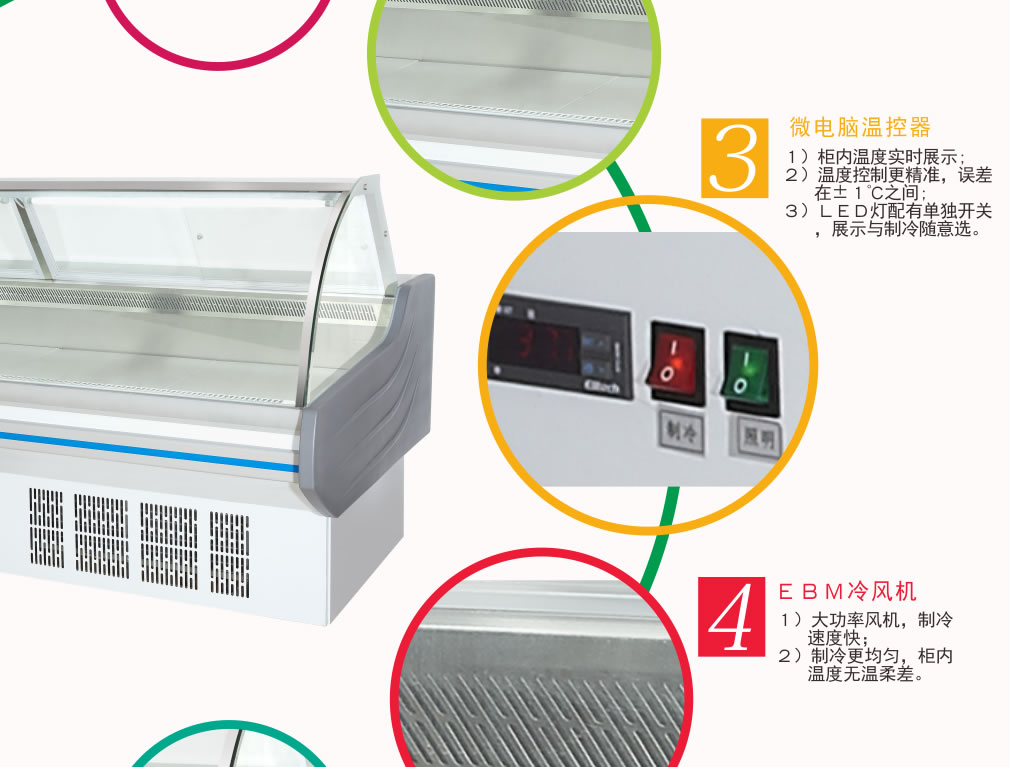 ① 風(fēng)扇或空調(diào)出風(fēng)口不能正對(duì)敞口式冷柜吹風(fēng);