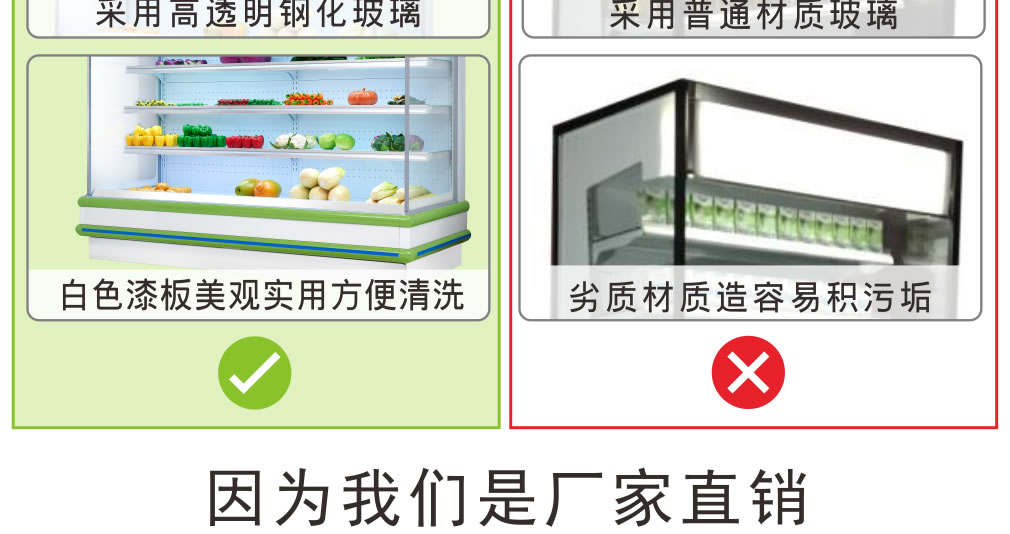 ① 風(fēng)扇或空調(diào)出風(fēng)口不能正對敞口式冷柜吹風(fēng);
